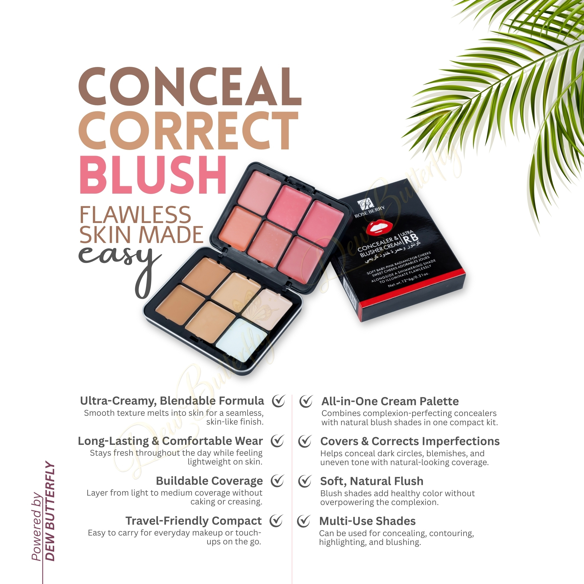 Enhance your natural beauty with the Roseberry Blusher & Concealer Palette — a perfect all-in-one face essential featuring silky blush shades and smooth concealers for a flawless, radiant finish. Ideal for everyday glam or full makeup looks.