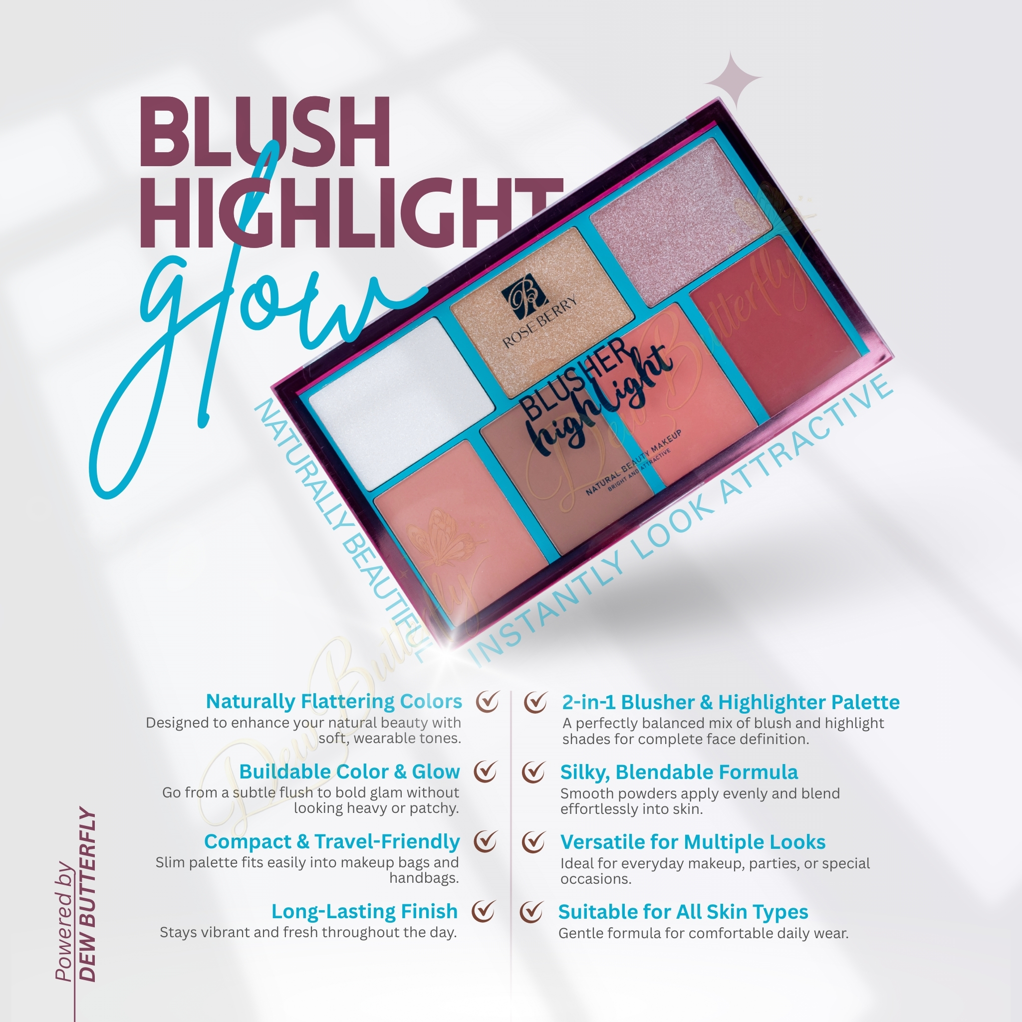 Roseberry Blusher & Highlighter Rose Palette features beautifully pigmented blush and highlighter shades that deliver a natural rosy glow and radiant finish. Smooth, blendable, and perfect for everyday to glam looks.