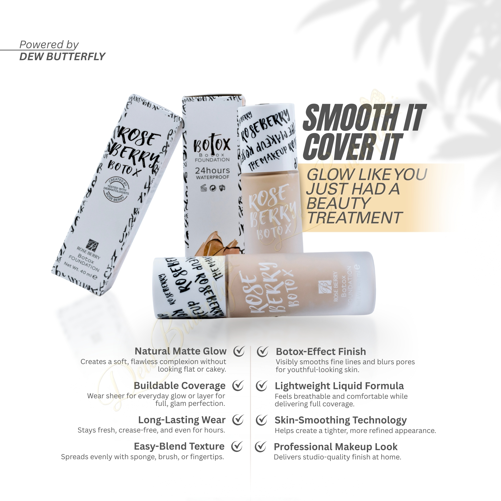 Achieve flawless, all-day coverage with Roseberry Botox Foundation 24H Waterproof. Lightweight, long-lasting, and water-resistant, it smooths, brightens, and perfects your skin for a radiant, natural finish.