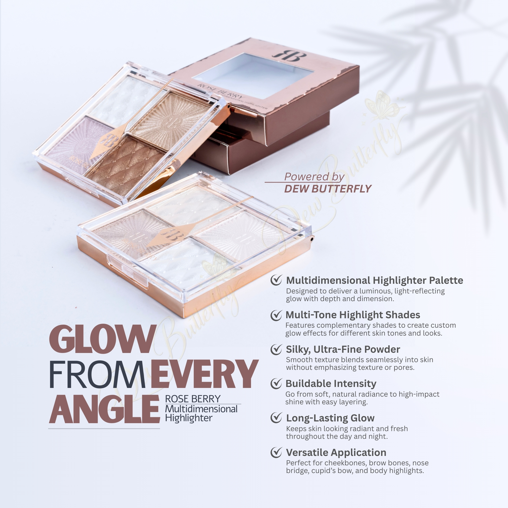 Perfect for cheeks, brow bones, nose bridge, cupid’s bow, and inner corners, Roseberry Premium Airbrush Highlighter adds that luxurious glow your makeup routine deserves.
