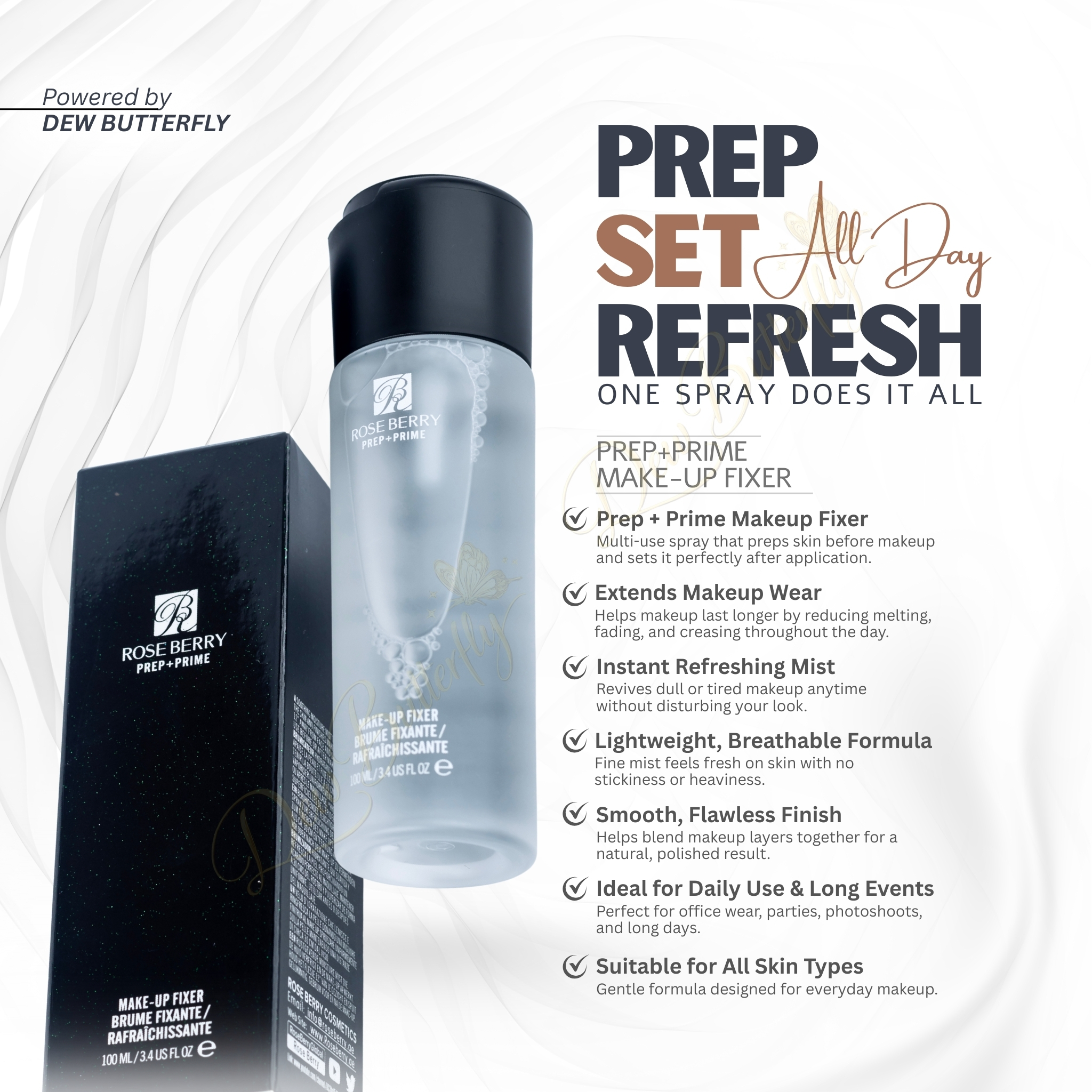 Roseberry Prep & Prime Setting Spray (Large) preps the skin, primes makeup, and sets your look for long-lasting wear with a fresh, smooth finish. Lightweight, hydrating, and perfect for daily use.